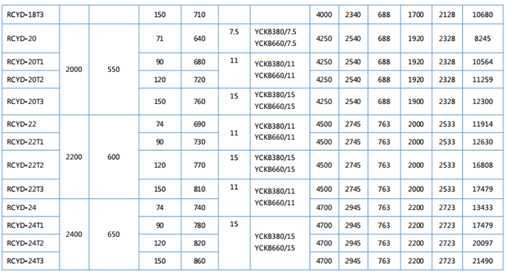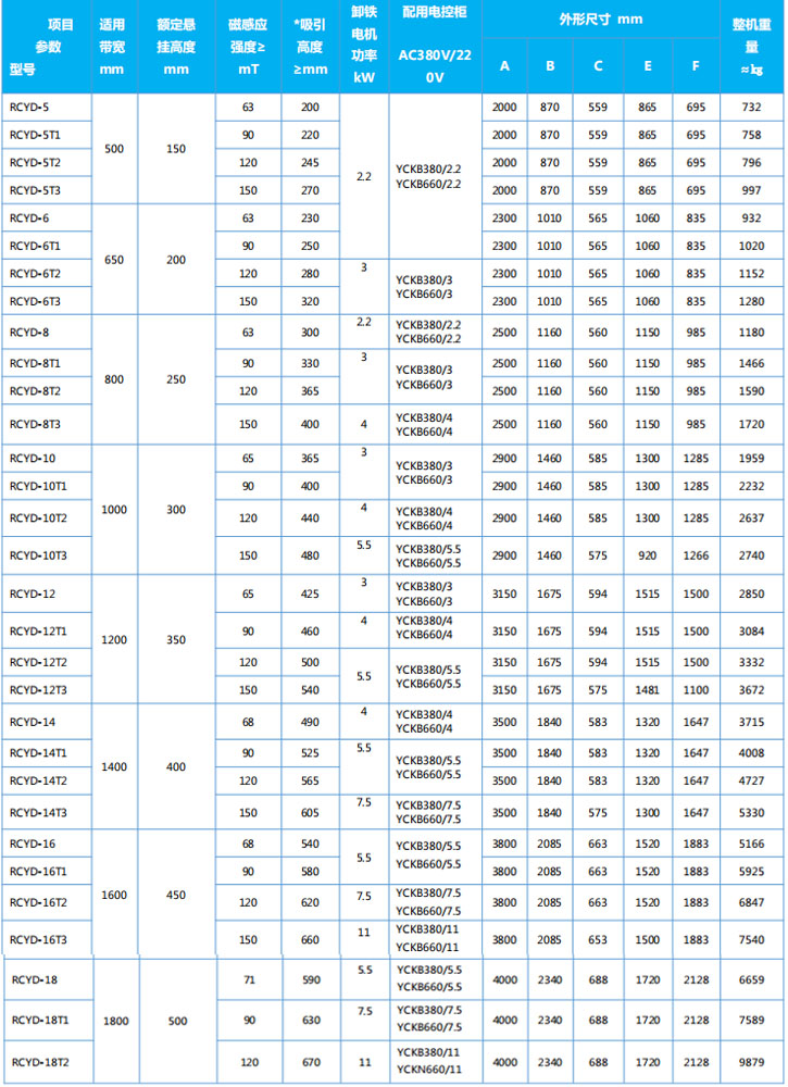 四、RCYD系列懸掛帶式永磁除鐵器主要技術(shù)參數(shù)、外形尺寸                      執(zhí)行標(biāo)準(zhǔn):JB/T8711