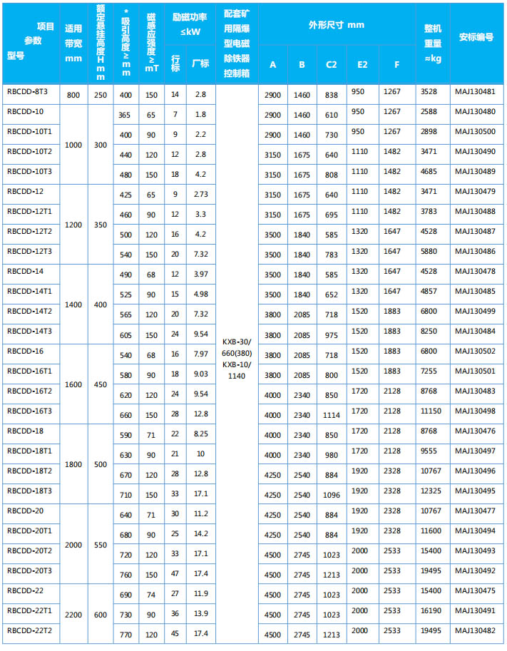 四、RBCDD系列隔爆型懸掛電磁除鐵器主要技術(shù)參數(shù)、外形尺寸 執(zhí)行標(biāo)準(zhǔn):GB3836-2010、Q/321191ACL003