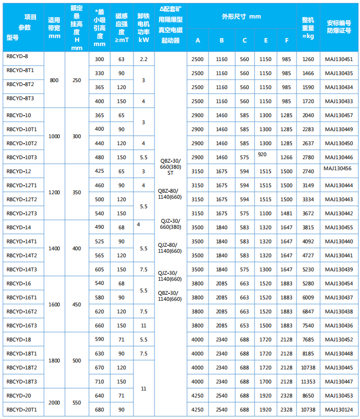 四、RBCYD系列隔爆型永磁除鐵器主要技術(shù)參數(shù)、外形尺寸  執(zhí)行標(biāo)準(zhǔn):GB3836-2010、Q/321191ACL002