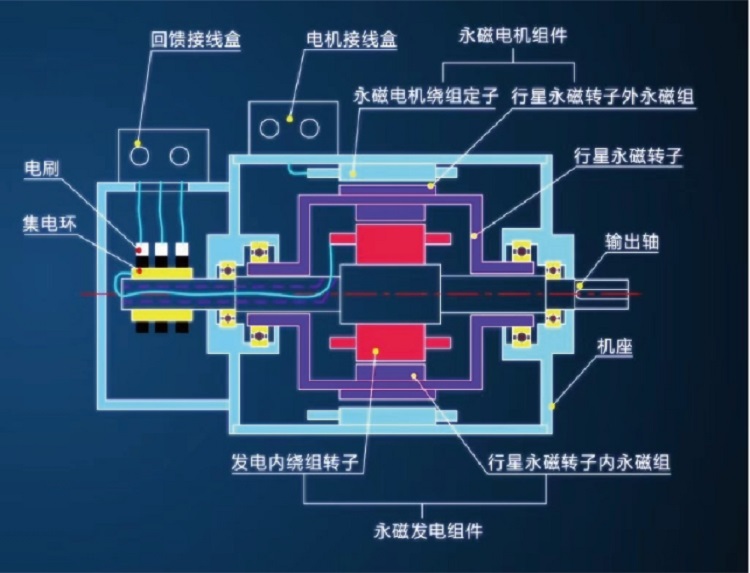 多功能雙永磁調速一體機是永磁電動機與永磁發(fā)電機嵌套集成的多功能電機。主要由內繞組轉子、內外雙永磁行星轉子及電機定子繞組組成,其中內繞組轉子是輸出軸,永磁行星轉子的外永磁體與電機定子繞組電磁耦合形成永磁電機;內繞組轉子與永磁行星轉子的內永磁體電磁耦合形成發(fā)電機,控制內繞組中的感生電流的大小控制轉子的輸出轉矩與轉速。并將內繞組中多余能量通過集電環(huán)回饋至電網(wǎng)再利用。