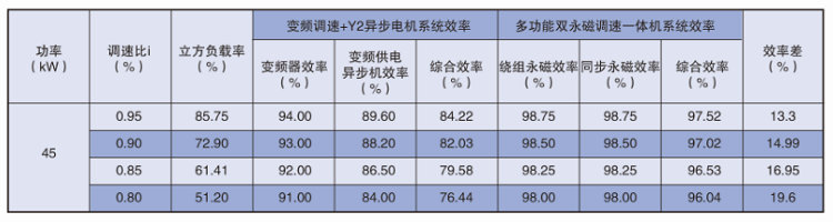 下表為與平方轉矩系統(tǒng)45kW-4(Y2系列異步電機使用變頻供電)同工況效率對比